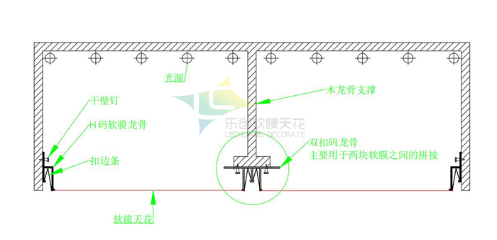 軟膜天花可以大面積安裝,最寬可以做5米不拼接,但由于其材料本身的柔韌性,存在一定的下垂,所以大面積安裝我們一般建議分塊安裝,下面給大家介紹一下分塊安裝的具體結構。 大面積軟膜分塊安裝,根據(jù)客戶的實際需求,我們一般建議分塊在2米左右寬度的,這樣能有效的避免下垂,那具體如何分塊呢?往下看,如下圖所示,四周正常固定專用的h龍骨,中間采用專用的雙扣龍骨進行分割,中間支撐桿可以采用木龍骨或者其他材料都可以,需要注意的是支撐桿的高度要比四周高大約2.5公分,這個是為了方便雙扣龍骨安裝在下部位置以后和四周h龍骨齊平。